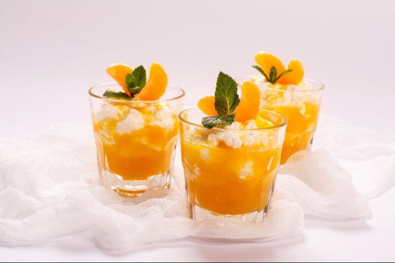 Pass the freshly-squeezed mandarin juice through a sieve to remove the citrus bits and seeds. Soften the gelatin in a small bowl of cold water. Remove gelatin and squeeze to reduce excess liquid. In a small sauce pot, gently heat milk until warmed (but not scalding or boiling). Place the gelatin and allow to dissolve.