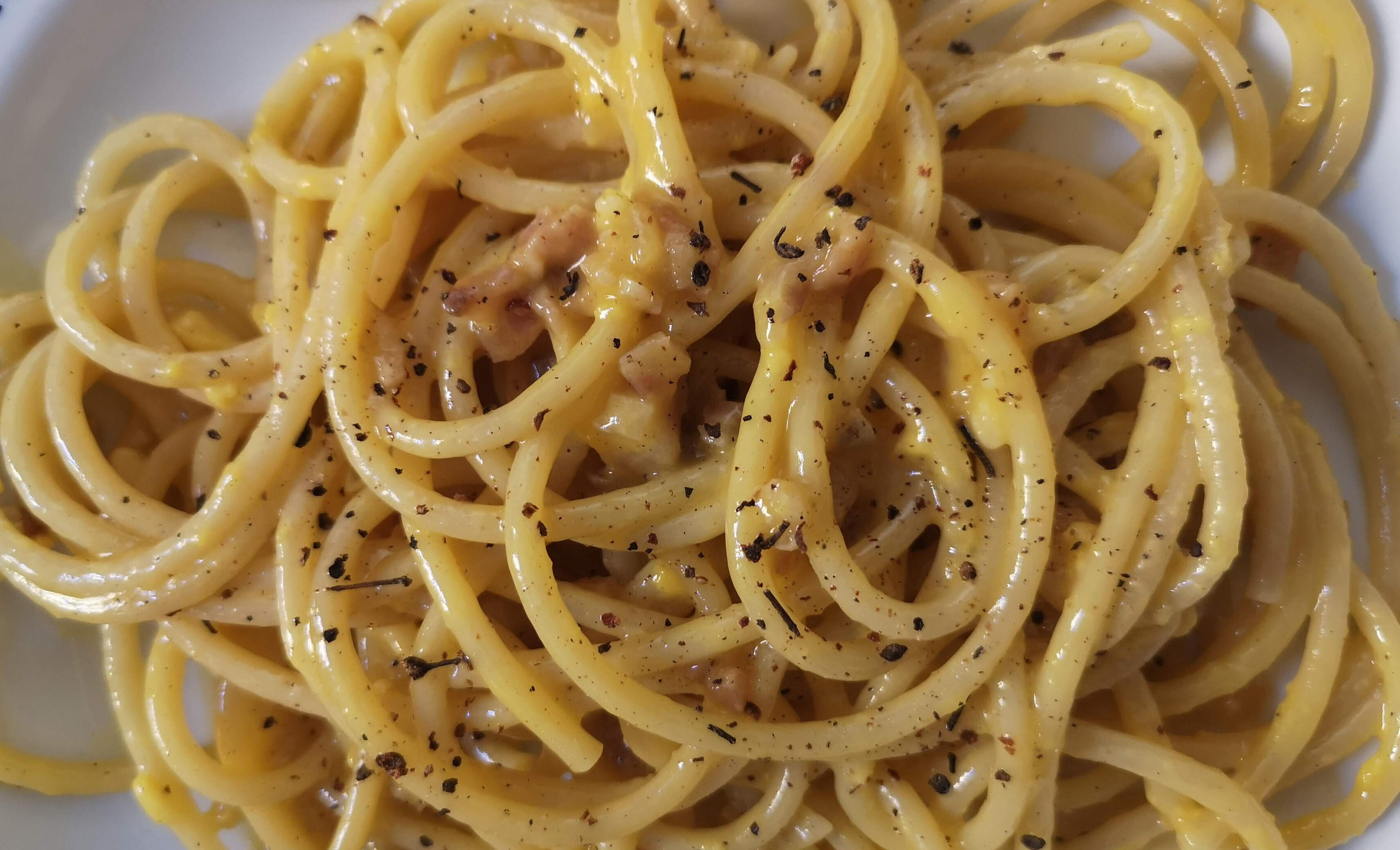 It is a famous and very popular first course, characterised by pasta served with an egg-based sauce and browned guanciale (bacon). It is known as a typical Roman cuisine, but its origins are much debated; the fact is that there are no traces of this dish in Roman cuisine before the end of World War II. The name would suggest a way of preparing the pasta peculiar to those who made charcoal in the mountains of Lazio.